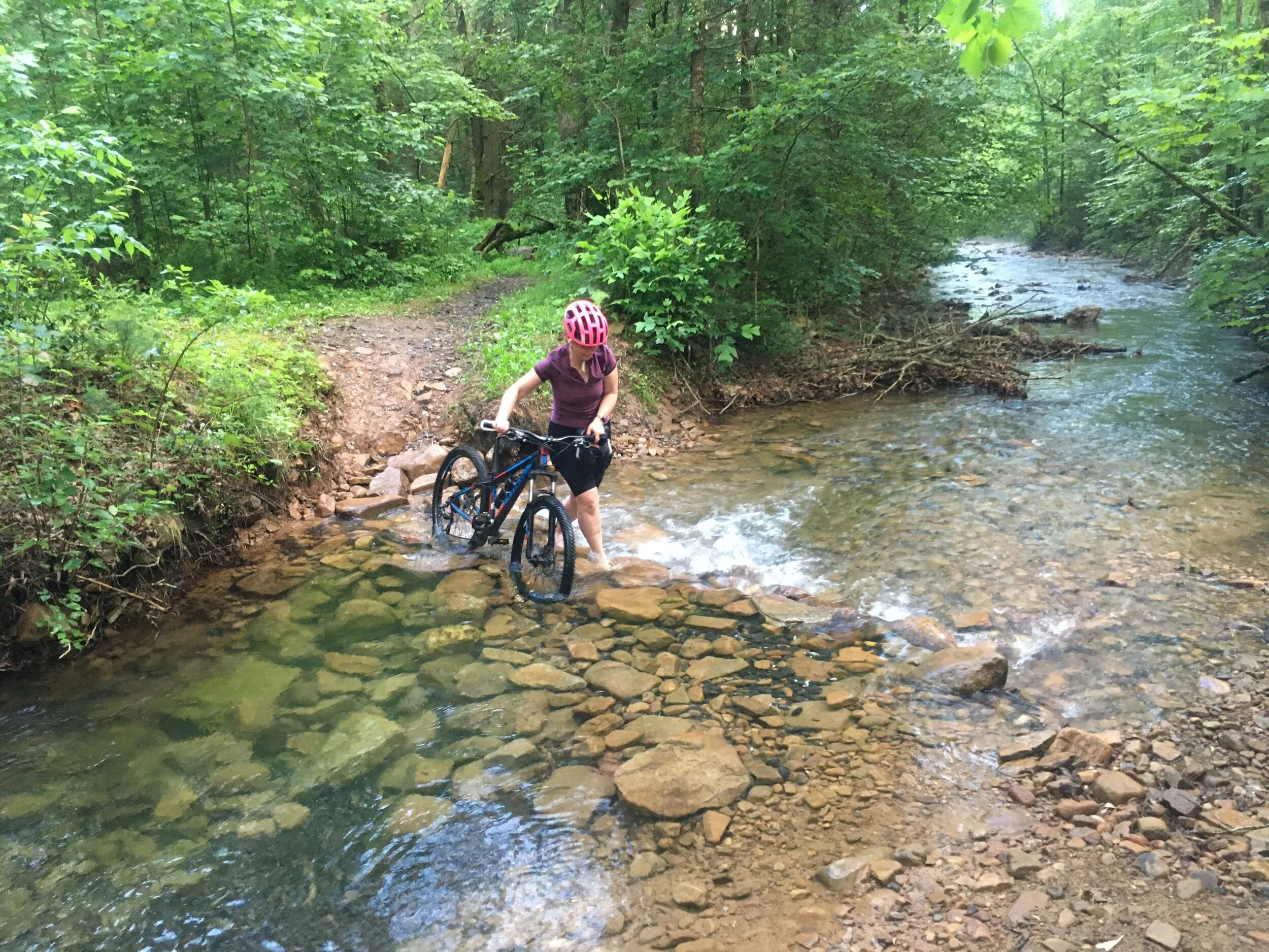 Jessica fording the stream at the bottom of Tillman West, near Stokesville