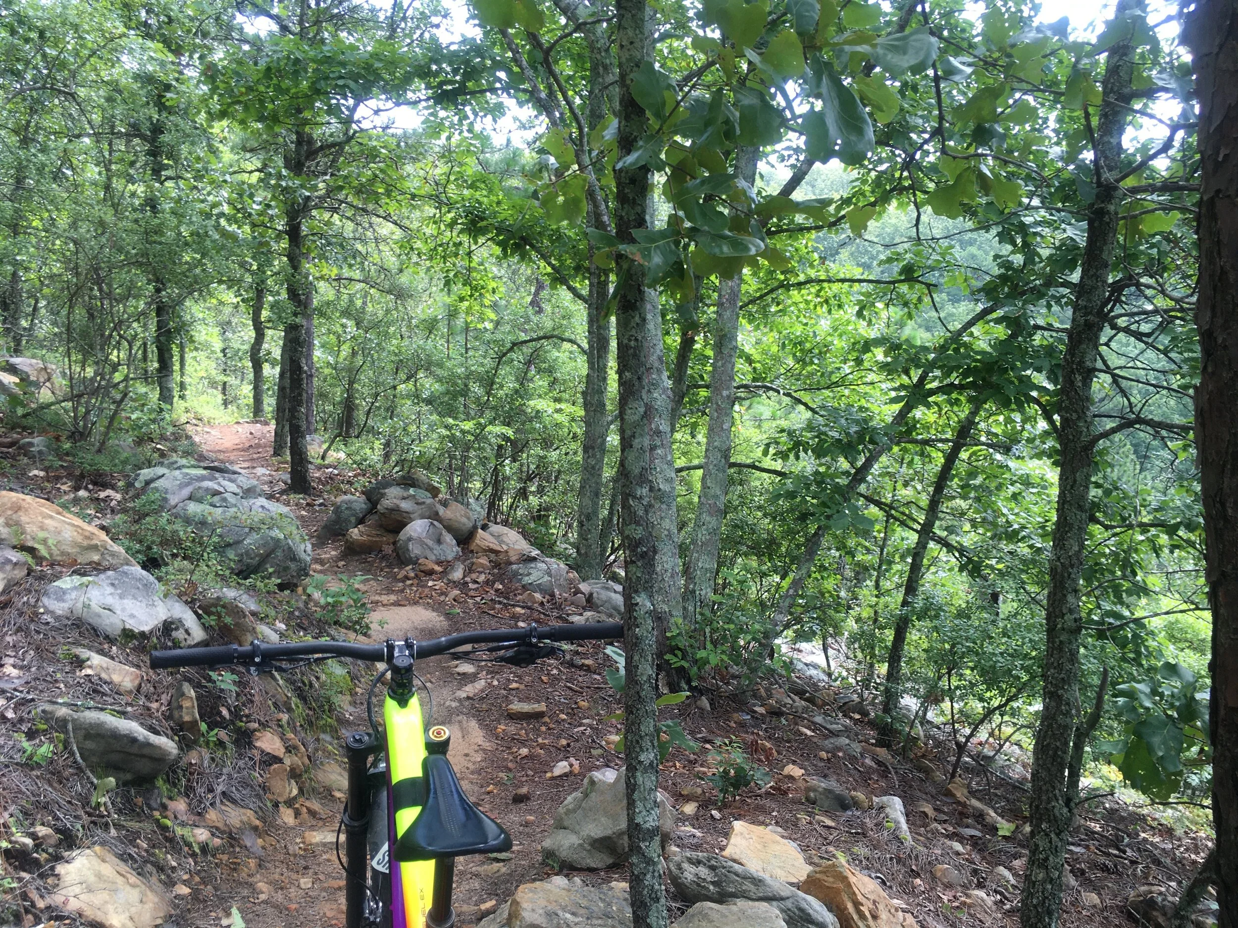 Oak Mountain is currently my favorite place to ride, given the quality of trail, variety of terrain, and proximity to Montgomery. The park itself is pretty impressive—they have just about every outdoor activity you can think of: cycling, hiking, swimming, fishing, camping, horseback riding, archery, golf, pump track, and even a nationally-famous BMX track. There are over 20 miles of trail at Oak Mountain, anything from green family-friendly flow trails to rough-and-rowdy tech trails—even a downhill-only jump line. I’ve spent multiple weekends exploring loops within the park, usually widing up and down the ridge multiple times on various trail types. I really enjoy the rough tech trails along the ridge, which feel straight out of a Virgina ridge top. The dual-personally of Jekyl and Hyde—rough-and-chunder at the top that ends with a pine-needle roller-coaster is a great way to end the day. A 3-4 hour ride with little overlap is not difficult to plan out.